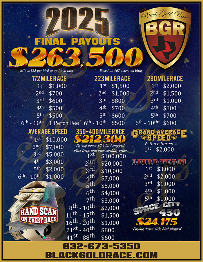 Dear Breeders and Racing Pigeon Fanciers. We are excited to extend an invitation to our one loft race. With almost 20 years of experience as a flyer in the Houston Texas area, I can assure you that our race is nothing short of thrilling. We would be honored to have your participation and witness your birds' exceptional racing abilities. Kindly consider joining us for a competitive and unforgettable experience.