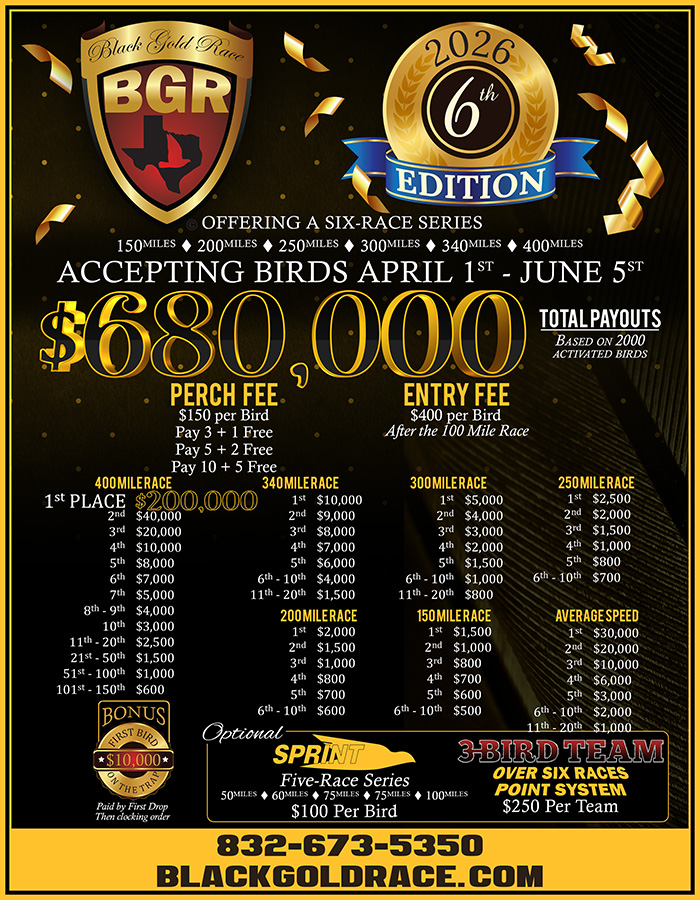 Dear Breeders and Racing Pigeon Fanciers. We are excited to extend an invitation to our one loft race. With almost 20 years of experience as a flyer in the Houston Texas area, I can assure you that our race is nothing short of thrilling. We would be honored to have your participation and witness your birds' exceptional racing abilities. Kindly consider joining us for a competitive and unforgettable experience.